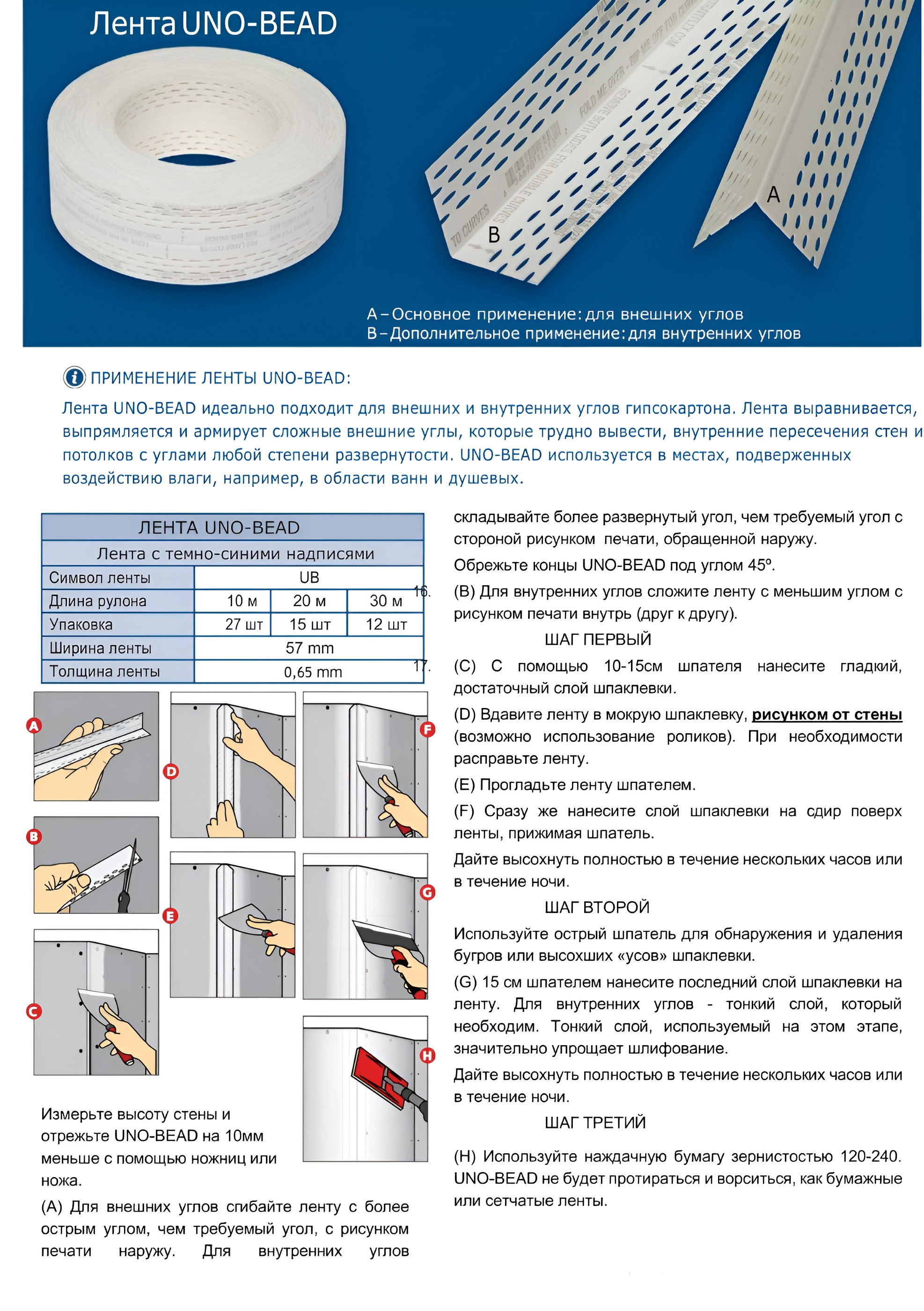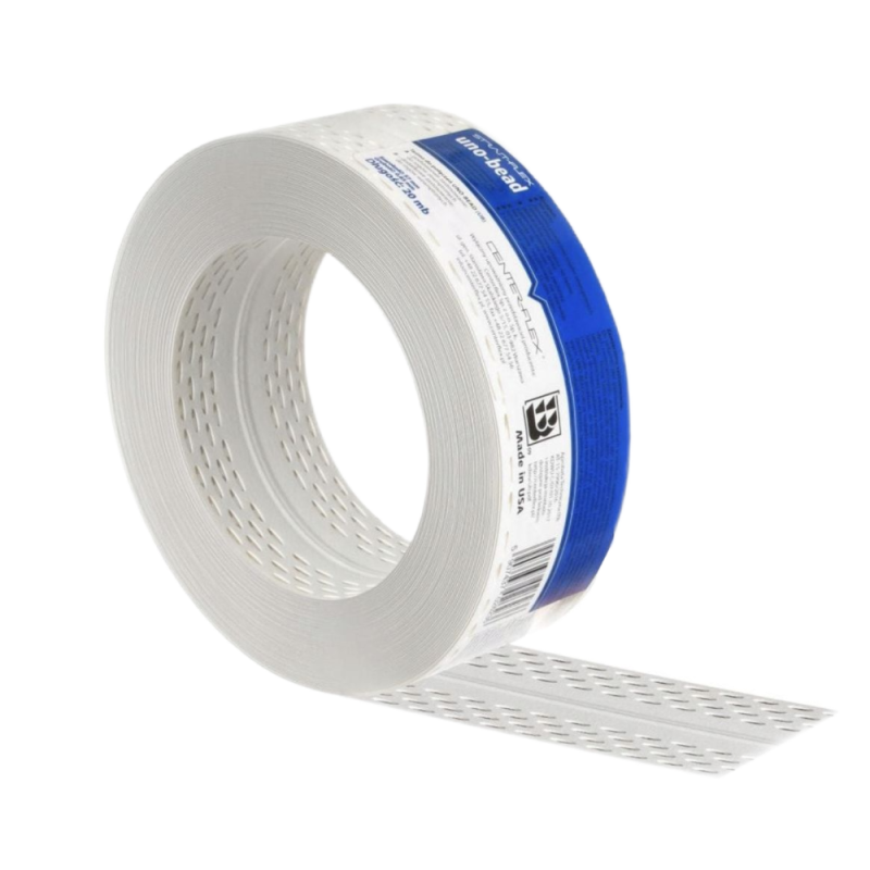 Армирующая лента Uno-Bead отлично подходит для соединения гипсокартонных листов на внешних и внутренних углах. Она создает острые внешние углы, что придает им эстетичный и прочный вид. Лента также выравнивает, выпрямляет и придает жесткость сложным наружным и внутренним углам стен и потолков с любой степенью раскрытия. Установочная перфорированная лента Uno-Bead используется в местах, подверженных воздействию влаги, например, рядом с ваннами и душевыми кабинами.