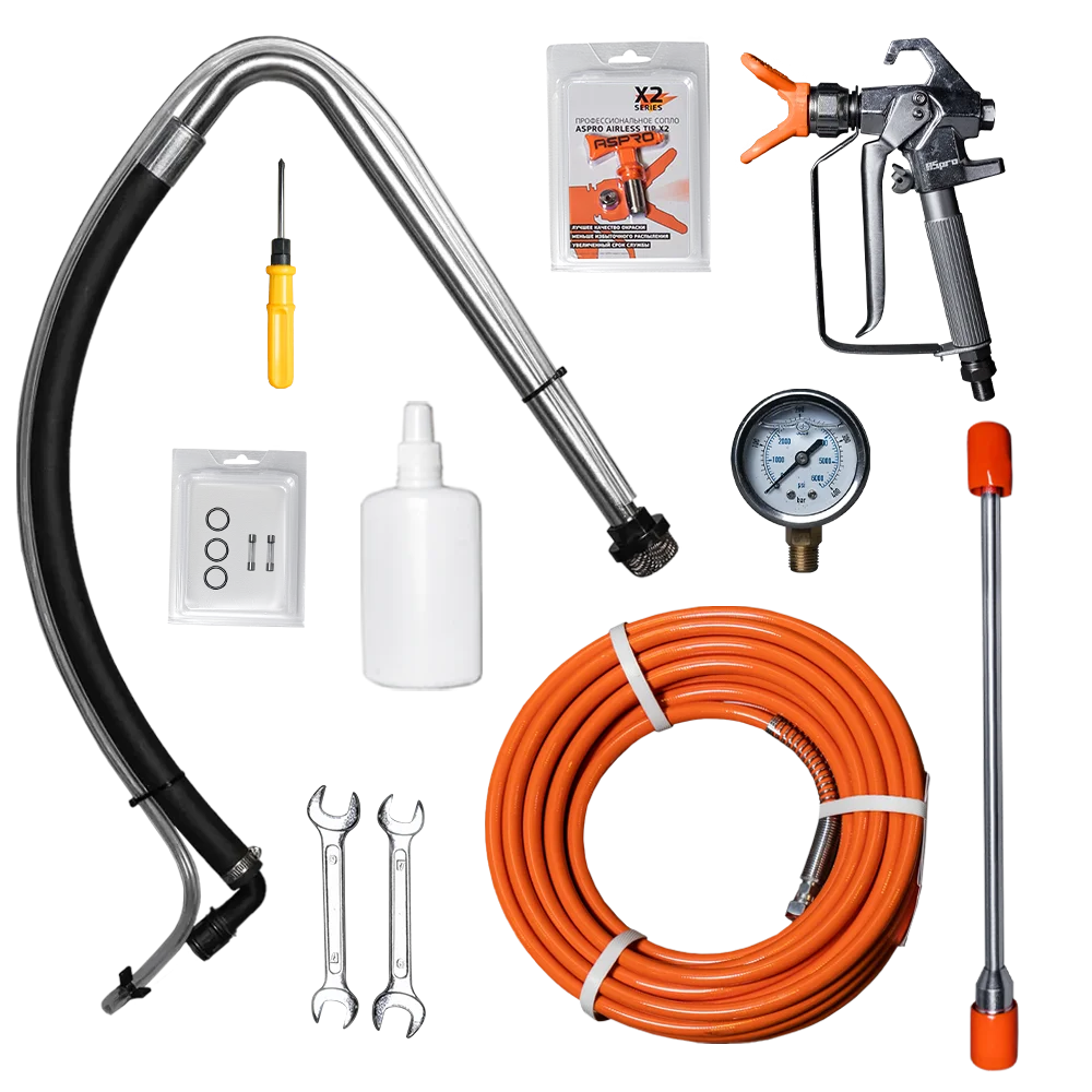 Доставлено всё целое, соответствует описанию. Проверили с водой, всё отлично работает. С краской супруг будет работать на объекте, отзыв дополню. В комплекте шланг 15м, ключи, отвёртка, маслёнка с маслом, удочка, пистолет, сопло и соплодержатель. Цена - качество соответствует, рекомендую