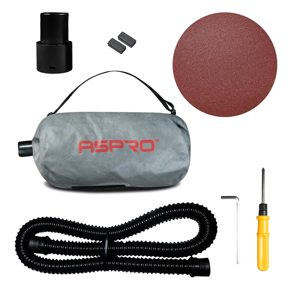ASPRO C-3 - Мощная, производительная, имеет хороший вакуум на плоскости. Оснащена мешком - пылесборником, это аксессуар особенно актуален на фасадных работах. Тарелка аппарата хорошо справляется с пылеудалением, а заборный шланг имеет выход снизу тарелки. Такое удачное расположение шланга, на мой взгляд, позволяет обрабатывать углы и примыкания стены к потолку без страха задеть отшлифованную область заборным шлангом.